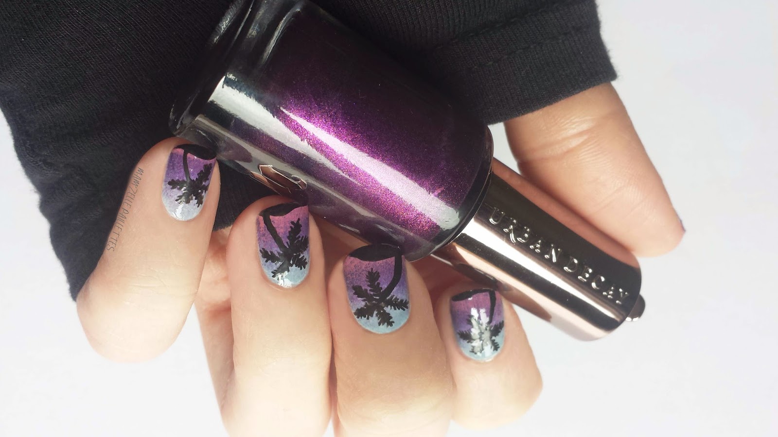 L'été arrive, le soleil commence à se montrer, bon entre deux jours de pluie mais il arrive, ça donne envie de partir en vacances non ? Moi comme je vous le disais pour mon précédent Nail art, j'ai envie de motifs genre palmiers ... un petit air de vacances quoi. Et puisque ça faisait longtemps, j'ai préparé un vrai tuto en step by step. Pour faire ce Nail art il nous faudra des vernis blanc, bleu, violet, et rose, une éponge, un stylo nail art ou un vernis noir ou de la peinture noir, bref de quoi dessiner et un liner ou pinceau pour avoir un tracer le plus fin possible. Pour les couleur j'ai choisi l'option coucher de soleil d'été, et ces jolis tons rosés, avec Trout Pout de Butter London qui va certainement être mon chouchou de l'été, Vice d'Urban Decay qui est un très joli violet pleins de reflets que l'on ne voit pas trop une fois dégradé et c'est plutôt pas mal puisqu'il s'intègre mieux avec les autres couleurs, et Parka Perfect d'Essie, un bleu clair avec un pointe de gris et quelques micro paillettes. On peut aussi opter pour un esprit plage au soleil avec des vernis jaune, orange, et rose.